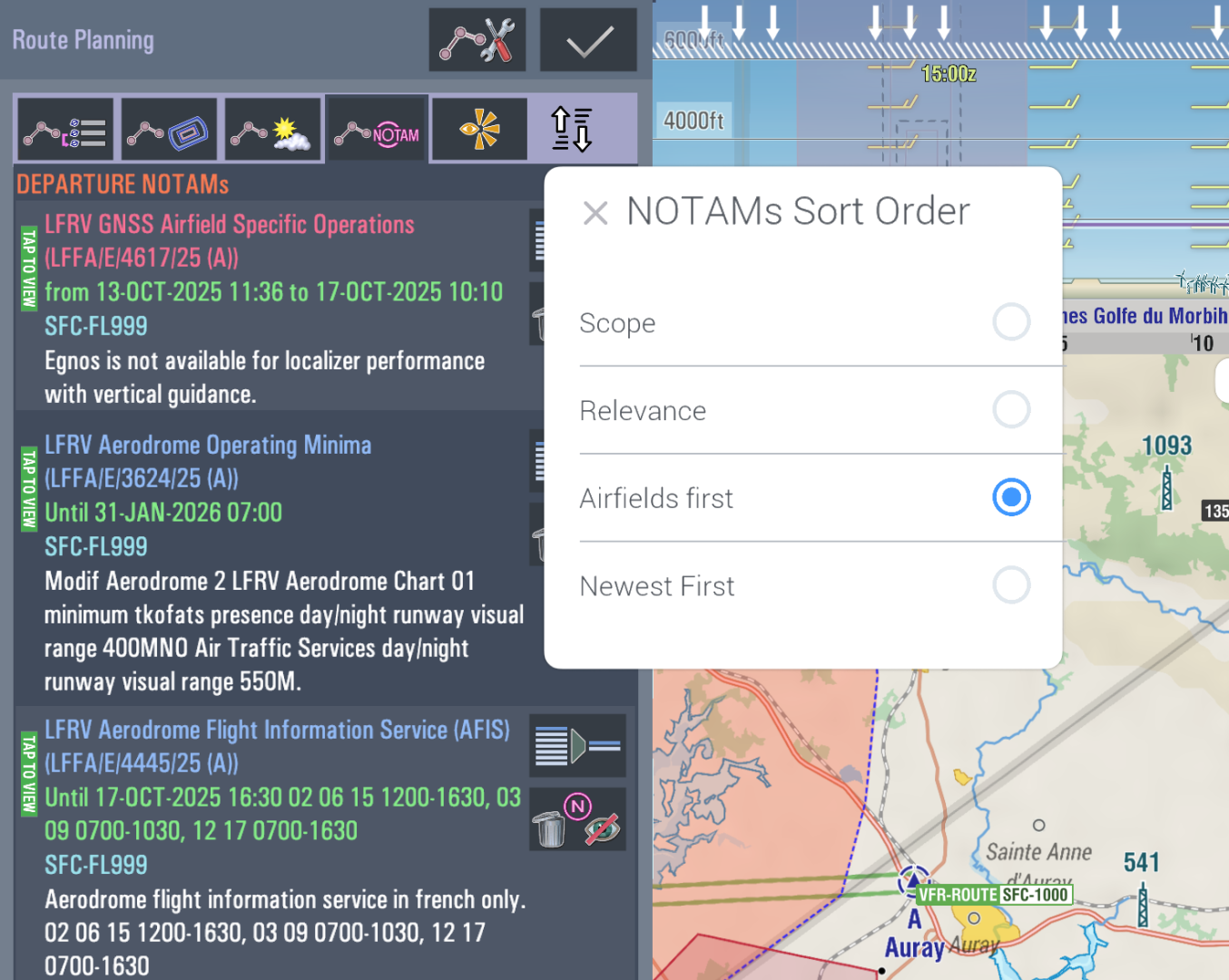 You can now sort NOTAMs by Scope, Relevance, Airfields first, or Latest first. How to use: Activate a route → open Pro Route Planning → NOTAM tab → tap the Sort button on the right of the tabs. Your chosen sort order is also used in the PDF TripKit.